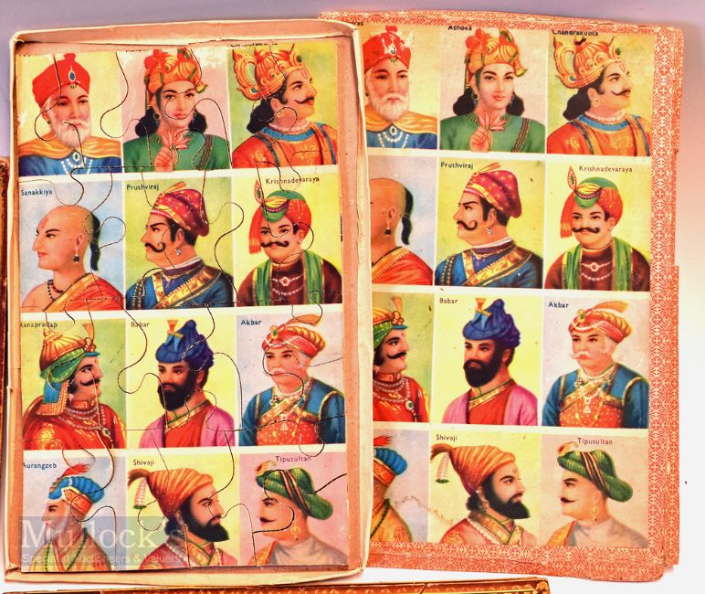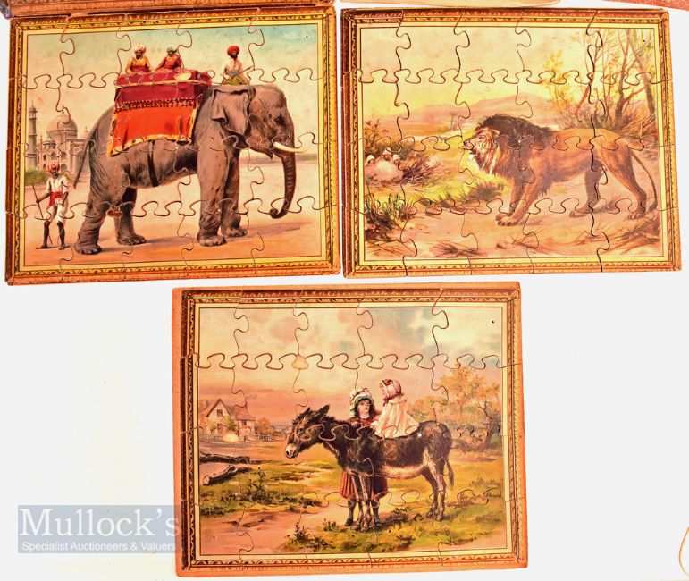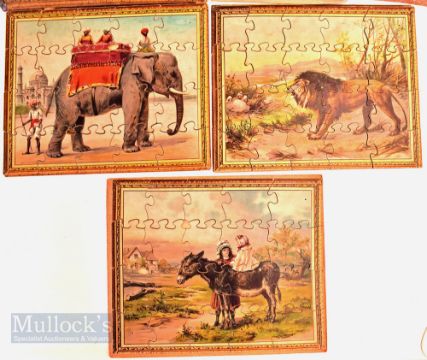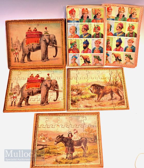 Early wooden Indian Jigsaws featuring 12 Portraits of Indian Rulers and Emperors complete and in original box, an Indian Elephant (two part pieces missing, see image) but still retaining the extra printed sheet so the pieces can be made plus two others of African lion and a donkey, box is top and base part only (4)