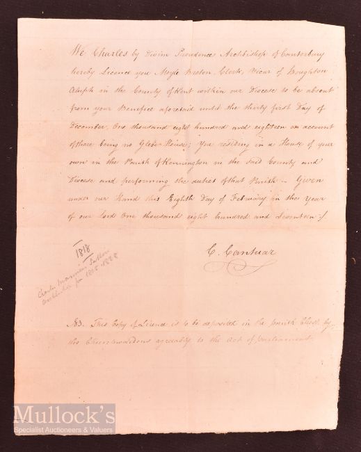 Autograph – Charles Manners-Sutton (1755-1828) Archbishop of Canterbury Handwritten document - Diocese document, signed 'C Cantaur', single sheet, with folds, otherwise clear text