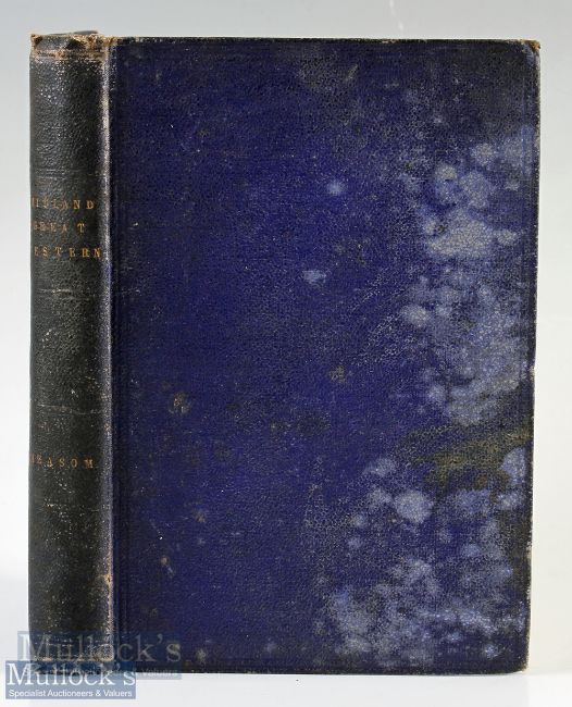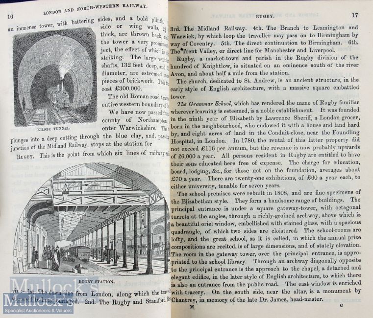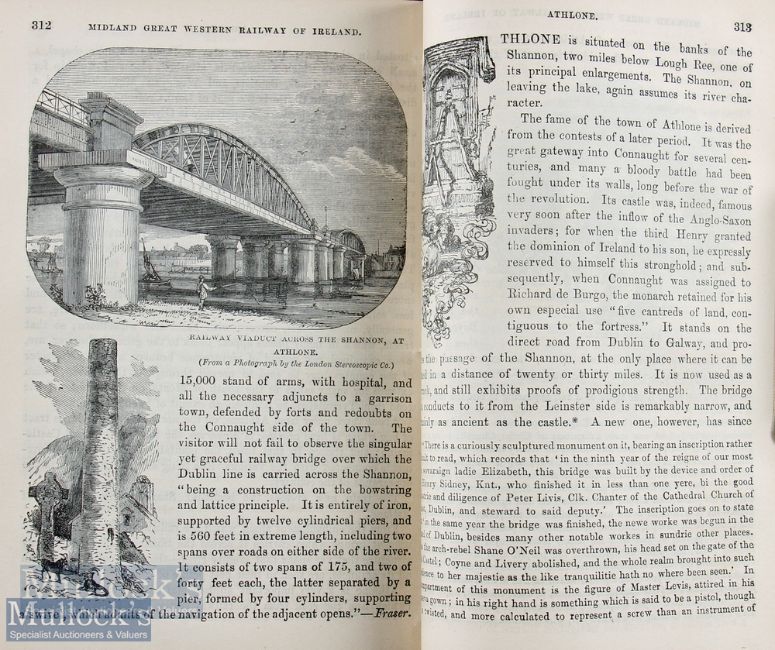 Railways - Ireland; The Official Guide to The Midland Great Western And Dublin And Drogheda Railways by George S Measom 1866 an extensive 400 page Guide with over 200 illustrations. There are a large number of full page panoramic views of factories and industry of the period, plus a number of picturesque towns and villages etc etc. Also detailing all the stations and places of interest along its lines and the then present operations of the railway Plus some 50 of these pages are detailing the line from London to Holyhead with many illustrations. In original blue cloth board binding, size 5¼" x 7¼", loose at spine, staining to covers