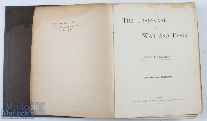South Africa - The Transvaal in War and Peace by Neville Edwards - Large hardback published in 1900 by H Virtue and Company. A history of the Transvaal with chapters on early history of the Boers, Causes That Led Up to the Present War, Kimberley and Cape Town, Pretoria, Johannesburg, Johannesburg's Gold Mines, Mining Life, Durban and Natal, Natal the Eastern Frontier, Resources of the Transvaal and Notes on the war. Has 384 pages profusely illustrated with several hundred photographs. Bit knocked about, but all there, reflected in reasonable price. Size 8 ½" x 10¾", loose at spine to front cover