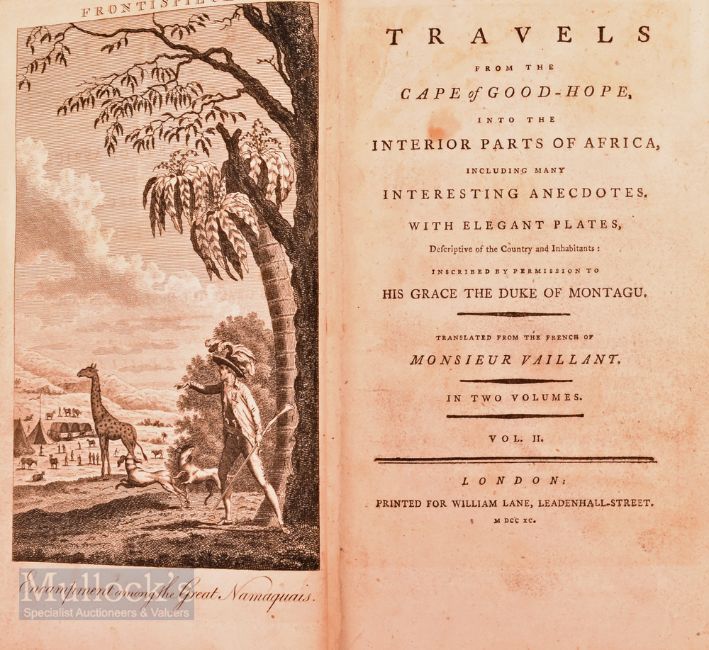 South Africa - Travels From The Cape of Good Hope Into The Interior of Africa Translated from the French of Monsieur Vaillant. 1790/ Two Volumes; Volume I. 442 pages. Volume II. 464 pages, both in leather bound boards. Volume I title page and engraving pages detached
