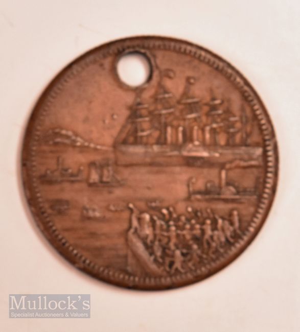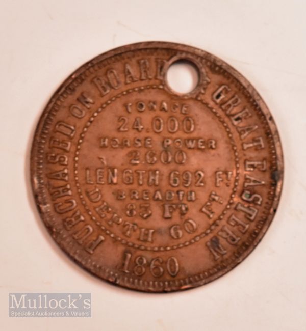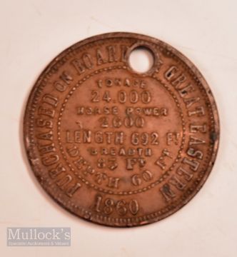 The Great Eastern Steamship Medallion, 1860 Obverse; View of the Great Eastern in New York Harbour. Reverse: Legend stating "Purchased in board the Great Eastern, Ships weight and dimensions etc. Copper Souvenir size 31mm diameter. These were mostly sold on board the ship during her 2 days cruise from New York to Cape May in July 1860