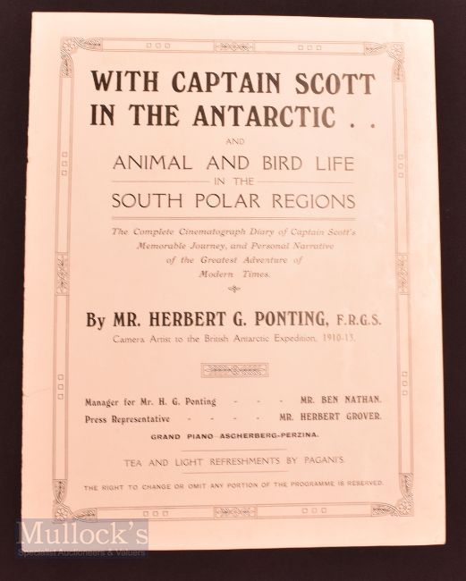 Early Film & Lecture Programme "With Captain Scott in The Antarctic" by Mr Herbert Ponting. When Ponting came back from the Antarctic he lectured and showed cinematographic film and stills of the expedition at The Philharmonic Hall, London. This is the 8-page Souvenir programme to that event. It is illustrated with what are now iconic images such as The Terra Nova and 4 other full-page photographs. An item well worth having. Printed on semi-gloss paper, size 7¼" x 9½"