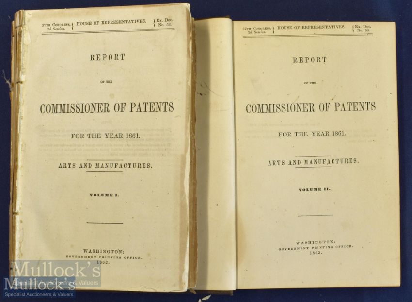 Americana – Mormon – Scarce Signature of Brigham Young – Report of the Commissioner of Patents for the Year 1861 with signature 'Pres Brigham Young' to front. Young was President of the Church of Latter-Day Saints, founder of Salt Lake City and polygamist with 55 wives, he was Governor of Utah (1849-57) until replaced by the Federal Government after the Mormon rebellion, with line illustrations of Patents, end papers toned, contents clean, embossed cloth covers, Vol II with a disbound copy of Vol I with text to the illustrations, scuffed (2)