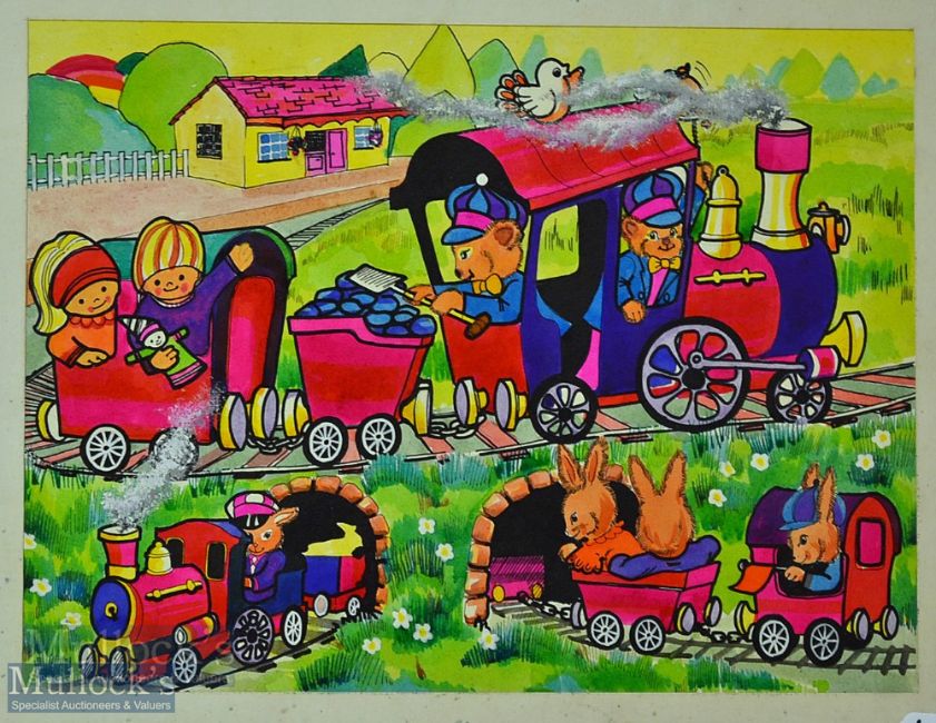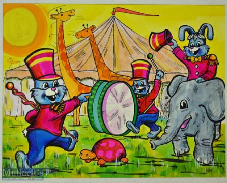 Original Artwork – Interesting Jigsaw Puzzle original artwork colourful designs for jigsaws with animal related scenes, minor speckled foxing in places, but overall appear G, measure 23x31cm approx. within card folders (4)