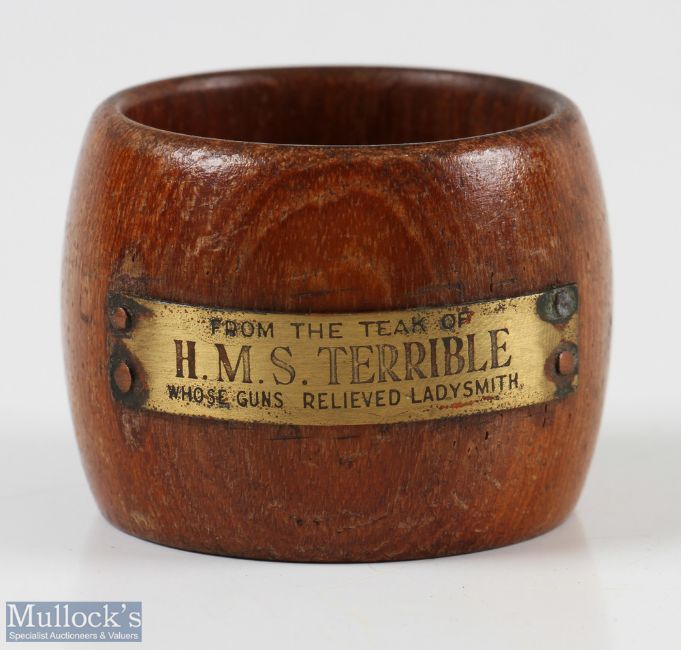 Boer War - Souvenir of HMS Terrible a napkin ring made from the Woodwork (probably from the Wardroom) with legend stating, "From the Teak of HMS Terrible whose Guns Relived Ladysmith". Size 1¾" dia