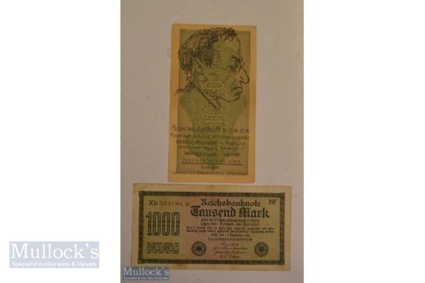 WWII Anti-Jewish Propaganda Banknotes inflation era German banknotes over-printed with Anti-Semitic slogans. These were used as propaganda tools placing the blame for hyper-inflation which ruined Germany throughout the 1920s on the Jews. 'The gold, the silver and bacon, the Jew has taken from us and left us with this filth' condition A/G (2)