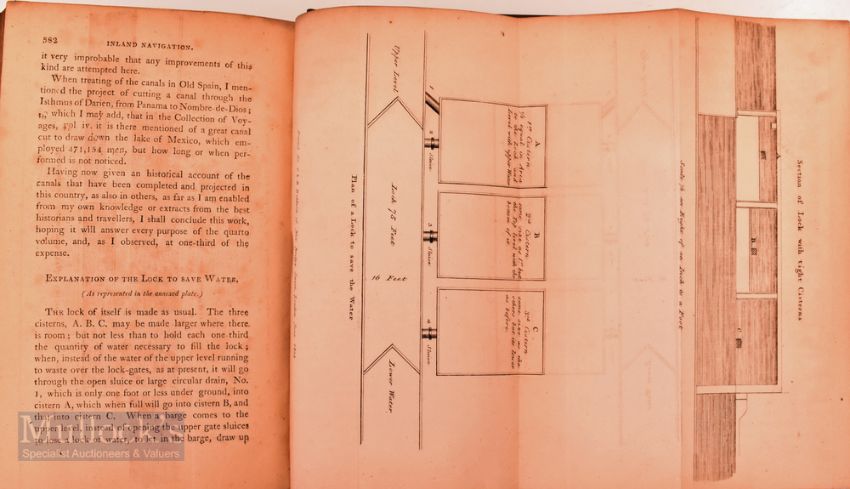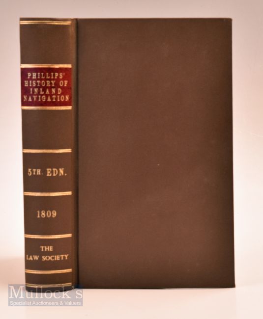 Early Canal Book "A General History of Inland Navigation" By J Phillips 1809 5th edition, subtitled; "Containing a complete Account of the Canals already executed in England with considerations on those projected". An extensive 598-page book detailing Canals the dates of Surveyed, details of constructions, workings, finances, distance, width, the wharfs and connecting railways etc. In expensive modern binding with fine gold tooling, size 5¼" x 8½".
