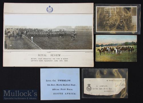C1900-1925 British Military Ephemera, to include Letterhead K company, 1st Stafford Regt (Boer War), photograph Royal Engineers, Royal review Aldershot, June 1925 postcards, D Company 2/1 Derby Yeo postcard R/P and Queens Westminster Volunteers 1905 postmark.