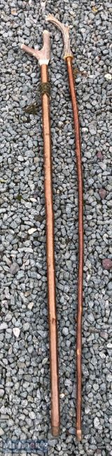 2x Walking Staff Sticks with Antler handles 1 has been made into a whistle, the tallest is 130cm