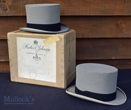 2x Gentlemen's Grey Top Hats, A Burslem & Sons Wolverhampton size 7.1/2, and a Moss Bros Top Hat, both have signs of wear