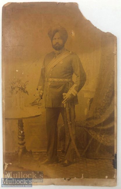 India & Punjab – Sikh Officer of Jind State Cabinet Card a fine original antique very large cabinet Card style photograph of a Sikh Chieftain of Jind, c1890, with stamp on reverse reading 'S Pritam Singh, Sangrur Jind State', corner chipped with loss but not affecting image, measures 30cms x 18cms