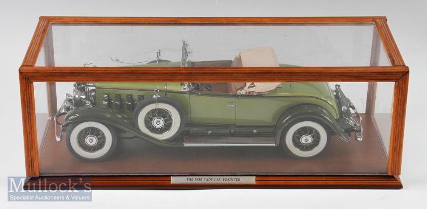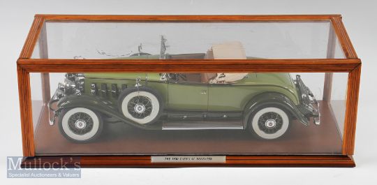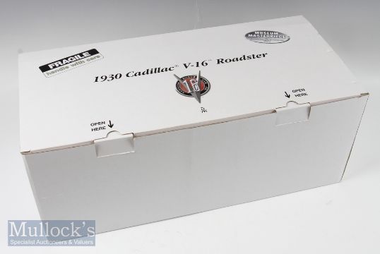 Danbury Mint Diecast 1930 Cadillac V-16 Roadster 1:12 scale model with wooden case, in used condition and has a couple of faults, 1 hub cap is loose, plus an exhaust chrome cover is loose, and a number plate is off all parts are present, Come's with original box, packing and certificate, a good-looking model.