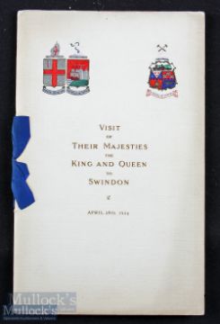 Visit of Their Majesties The King And Queen To Swindon April 28th 1924 Programme an impressive 15 page programme plus 18 mostly full page photographs of Locomotives, Carriage's and the Railway Works at Swindon, with detailing text and itinerary. Plus fold out map of the extensive GWR Works. Printed of finest thick art paper in card cover tied with silk ribbon with embossed & coloured front cover, size 6¼" x 10"