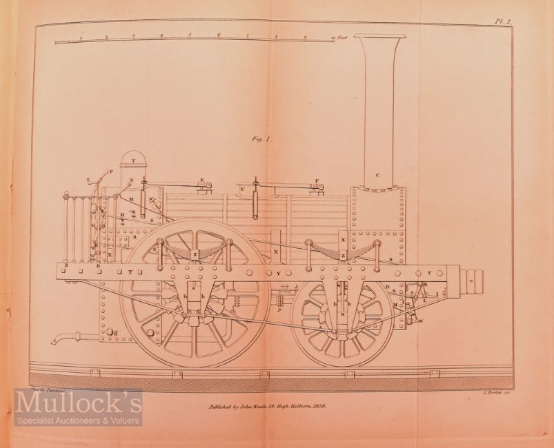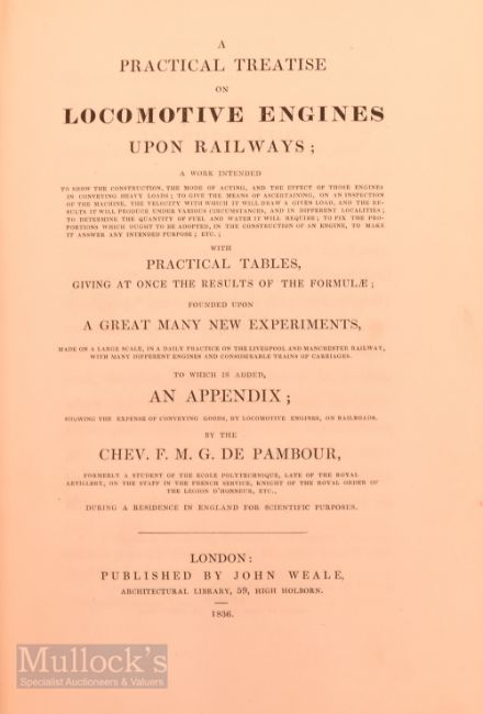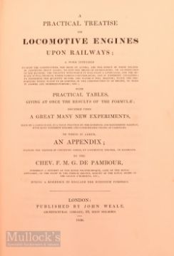 A Practical Treatise on Locomotive Engines Upon Railways by Chev F M G De Pambour 1836 first English edition. A detailed 365 page book with 4 folding engraved plates, Giving much very technical information regarding Locomotives and railway track and their construction and working. Bound in modern calf, spine gilt, size 6" x 9¼" (Pambour's treatise gained almost immediate international attention. He had privileged access to the fledgling lines and manufacturers in England, especially the Liverpool and Manchester and Grand Junction lines and it was in their workshops that he made his experiments. Two of the plates are technical drawings of the Stephenson engines employed on the former line). The work on this modern binding was expensively done by a leading bookbinder.