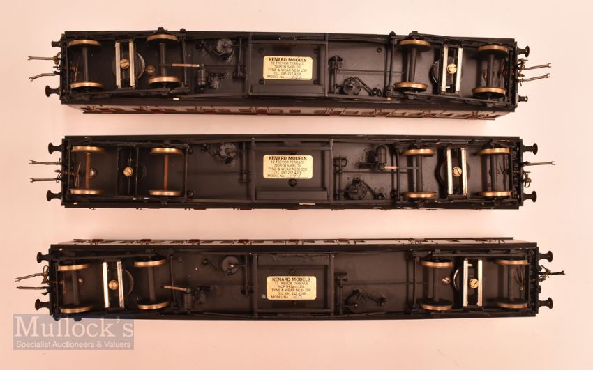 A Rake of 3 Kenard Models O Gauge Model Railway LMS Fine scale Coaches 1st /3rd class composite marron coaches, numbered models 196,201,199 .1 has 2 brass buffers missing otherwise in very good condition,