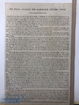 India & Punjab – 1859 Antique two page Biography of Duleep Singh on His Highness the maharajah Dhuleep Singh, published in 1859. One of the earliest biographies written on the Maharajahs' early years in the Punjab, the Sikh kingdom, the Anglo Sikh wars and his baptism to Christianity