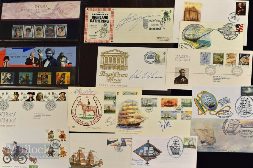 Signed commemorative stamps Bank Star Shipping - to include 1976 Highland Games signed Joe Bugner, 1980 Royal Opera house signed Kiri Te Kanawa ,200th anniversary of the Derby signed by Willy Carson and Lester Piggot,4 posted at sea UAS covers Star of India station plus a few British first day covers and mint sets, plus a folder of parts set of Wills Cigarette and John Players (17)