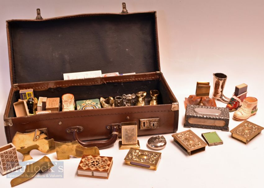 Collection of 20x Period Matchbox Holder match strikers in a small travel case, brass, copper pewter, ceramic examples