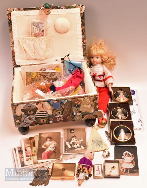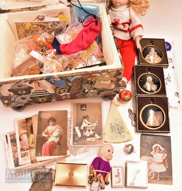 Padding small stool full of doll and craft items, Framed dolls, purses dolls house items mirror, fan, doll postcards