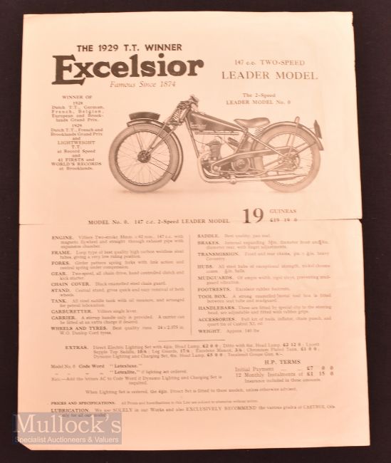 Excelsior Motorcycles 1929 Brochure single sheet brochure illustrating and detailing their 147 cc Motorcycle for 19 Guineas. Size 8½" x 11"