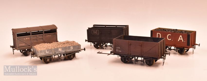 Three Aitch Models Finscale O Gauge Model Railway Wagons Rolling Stock to include LMS 10t wagon, LMS 256167 wagon, LMS 239715 open wagon, DCA coal wagon, Kobo high sided wagon with damage to 1 end. (5)