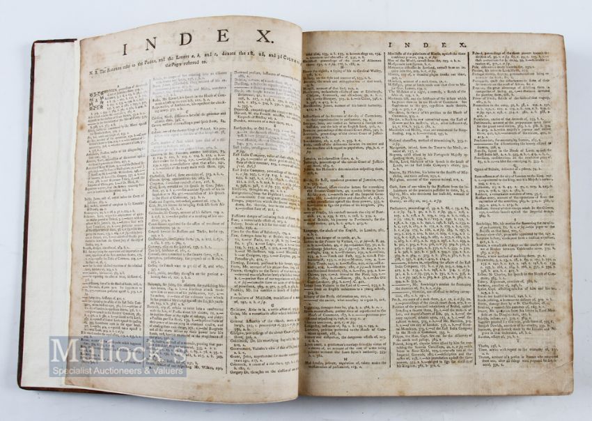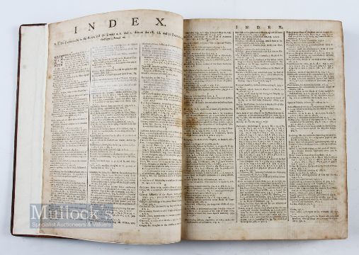 1772 Early Golf Reference - Very Rare Period Leather Bound Collection of The Edinburgh Advertiser Newspapers Vol. XIX - c/w title page covering the period from December 9th 1772 to June 29 1773 - full index - printed by Alexander Donaldson sold at his shops in London and Edinburgh - see p.94 col.2 Golf House At Leith for let; p.101 col.2 Montrose a young boy of 9yrs drowned on Montrose Links after falling through ice on the links; p.149 The Silver Club given by Good Town of Edinburgh to the Honourable Company of Golfers, to be played on The Leith Links on 13th March by Order of The Captain; p.174 col.1 on Saturday The Silver Club was played for at Leith by The Honourable Company of Golfers was by Duncan Macmillan Esq - bound in the original leather boards (rebound) c/w ribbed spine c/w title - great piece of social history incl runaway slave et al c/w typed page detailing all the golf references. Note: Part Three - Golf Collection from "David Easby Estate"