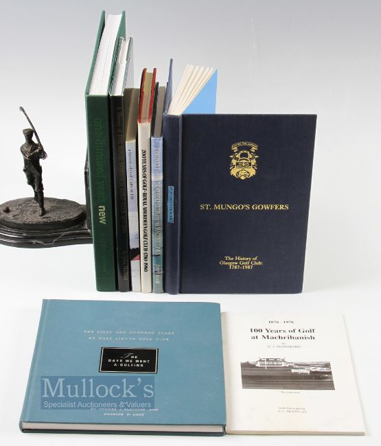 Golf Club Histories (8) features History of The New Club St. Andrews, The Royal Dornoch Golf Club 1877-1999, The First One Hundred Years of West Linton Golf Club, Royal Aberdeen Golf Club 1780-1980, St Mungo's Gowfers History of Glasgow Golf Club 1787-1987, A History of Golf Clubs in Fife SB, Chronicle of the Islay Golf Club and the Machrie Links and 100 years of golf at Machrihanish SB - condition mixed A/G overall
