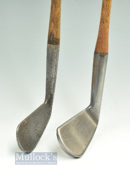 D Anderson & Son St Andrews SMF Sand Iron - with good clear stamp marks and fitted with an exceptionally fine full length original hide grip with underlisting and another D Anderson St Andrews "The Glory Driving Iron diamond back with ball pattern punched face dot markings - fitted with good full length replaced hide grip with thick underlisting. (2)