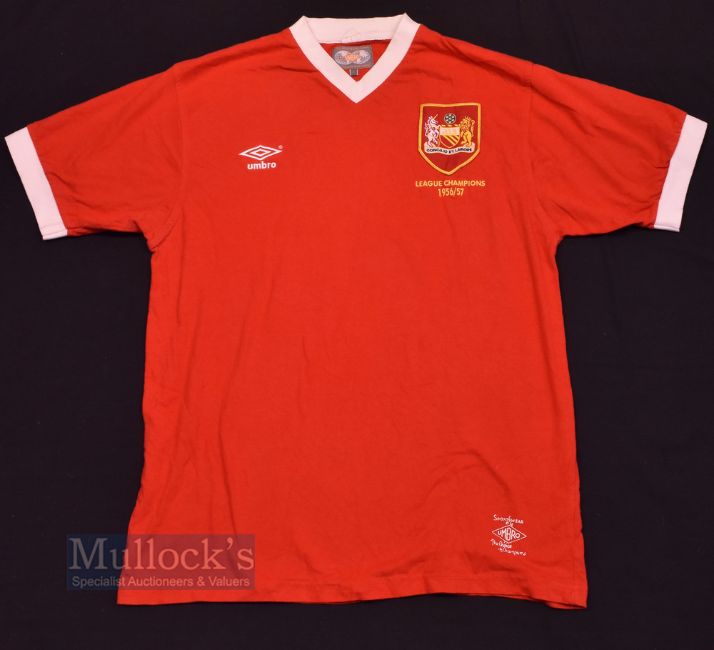 Retro Modern Replica 1956/57 'Concilio et Labore' Manchester United football shirt size large, in red, short sleeve, by Umbro 'League Champions 1956/57', appears unused