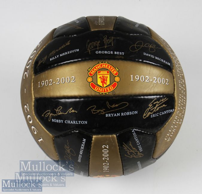 Man United 100th Anniversary Football 1902-2002, attractively coloured and printed with facsimile signatures of Billy Meredith, Bobby Charlton, George Best, Bryan Robson, Eric Cantona & David Beckham. VG