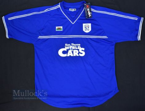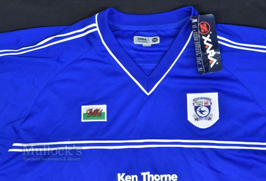 2001/02 Cardiff City AFC Home Football Shirt XARA Soccer, Ken Thorne World of Cars, in blue, short sleeve, size XL
