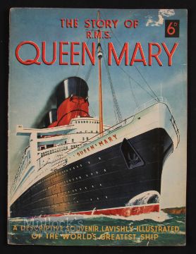 Maritime - RMS Queen Mary - A Descriptive Souvenir Publication Lavishly Illustrated of The World's Greatest Ship. 1935-36 - A 60 page publication with over 60 photographs and illustrations of the Ship its Public Rooms and Cabins etc. Plus extensive detailing text. Published while the Ship was still being fitted out. In multicoloured cover, size 9" x 12"