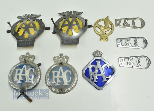 AA, RAC, Eagle Club Magazine/Comic Car Mascot Badges, 2 AA badges from the 1950s No. OW66402 - OS16717 both with fixings 3 RAC badges 2 have no fixings, and plastic fronts have some damage, an Eagle Club badge from the British comic plus 3 Bang and Olufsen bottle openers