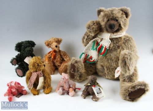 7x Artist Jointed Bears collection, to include a Barton creek collection by Gund Large Papa Paws #60cm, Celia Lloyd Penrose, Maxine Large Plato, Russ mohair vintage editions x 2 small teddys #14cm, Boyds mohair Settia, and Tonge's Teds Dimitri (box of 7)