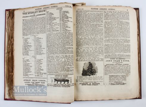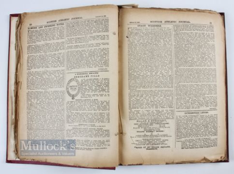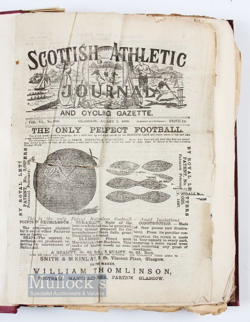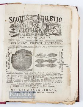 1888 Scottish athletic Journal & Cycling Gazette -January -May 1888 bound sporting newspapers, with early Scottish Football interest, covers quite a few sports around Scotland with fixture and result, does have a few damaged pages, page 1 is torn page, page 11 an article cut out from it and a few other pages have tears to them,