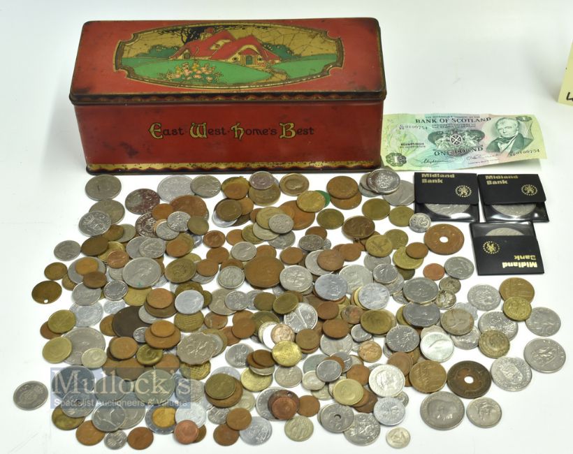 A CWS Biscuit Tin of Mixed Coins, to include world coins and a few British coins and Scottish banknote