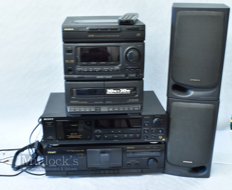 Music Stereo Cassette Decks and Cd Player- features SONY TC K677ES Stereo Cassette Deck, a TEAC V-377 Stereo Cassette Deck plus an Aiwa NSX-340 Digital Audio System CD and Cassette player with two speakers. From a deceased estate of Disc-Jockey and compere, all maintained within a dry, insulated garage (3)