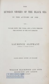 Russia - The Russian Shores of The Black Sea in 1852, with A Voyage Down The Volga and Through The Country of The Don Cossacks by Lawrence Oliphant 1854. A 380 page book with over 30 illustrations within the text. Also 2 Maps. Giving an extensive account about the Cities, travel on the Railway, Nobility & Merchants, Bondage of the Russian Peasantry. Travel on the roads by Tarantasse, life among Tartars and Don Cossack, Crimea etc. Fine binding with cloth boards and ribbed leather spine, size 5 ½ x 8½"