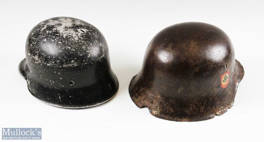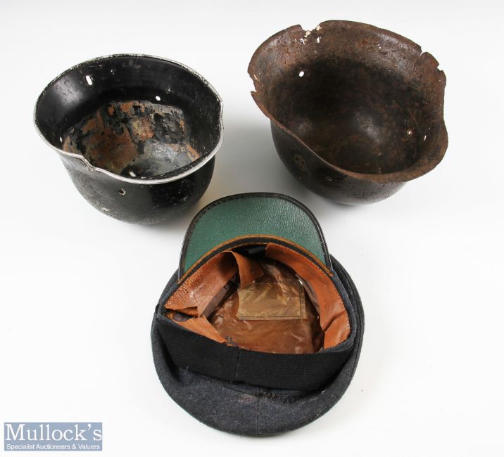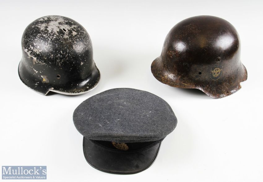 c1934 German Fire Raid Fire Protection Police Helmet Shell, plus a WWII RAF Cap, a Steel German Shell c1934 is made of aluminium, missing its top fin, the other is made of steel with wear and appears with later added decals (date unknown), both missing their liners. The RAF cap is worn inside rim, with cap badge (3)