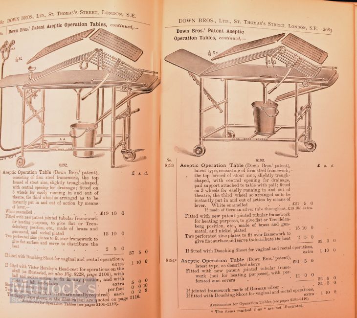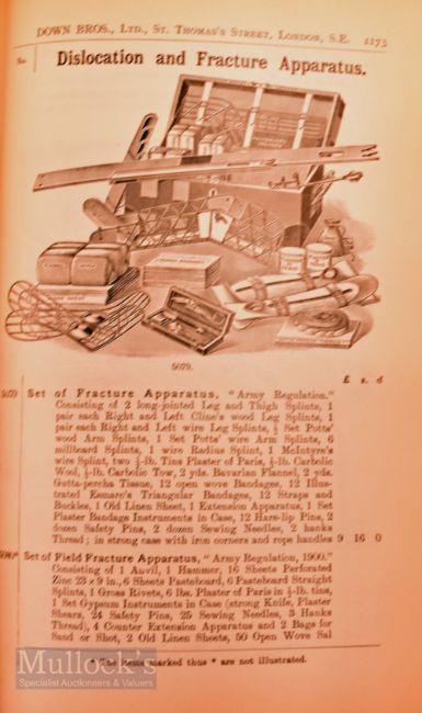 Catalogue of Surgical Instruments and Appliances Also Aseptic Hospital Furniture "Down Bros Ltd, 1906 Brochure - large extensive 2,247 page catalogue illustrating, detailing with prices several thousand items of surgical, medical and hospital equipment of the period. Printed on quality semi-gloss paper in cloth board covers. Very large size of 6 ½ x 9 ¾" and 3" thick