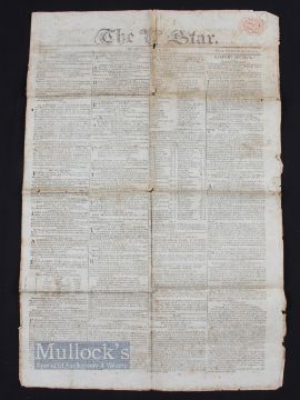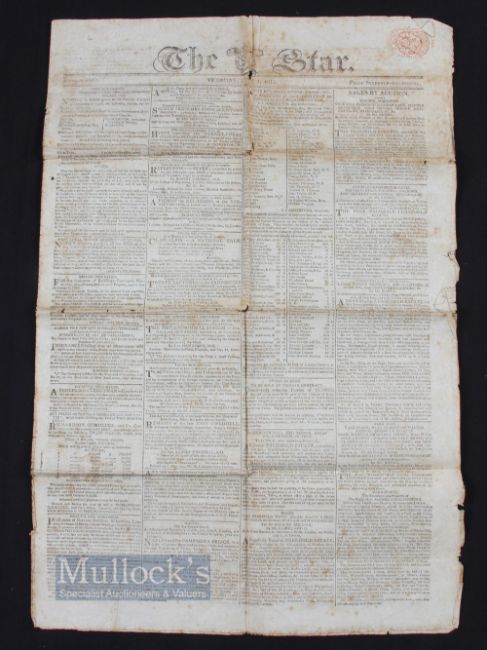 1815 The Star Newspaper - features 'Battle of Waterloo….Map of the seat of War', contained within The Star newspaper dated Tuesday 4th July, heavily folded, tears to edges speckled foxing in places