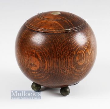 Oak Tea Caddy in the Form of a Bowls Ball hinged lid with alloy liner, all on 4 ball feet