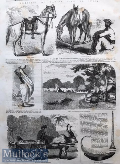 India And Punjab - Sketches of Native Life in India and Sikh Horse, 1858 An original ILN wood engraving titled Sketches of Native Life in India 1858, from drawings from the sketch-book of Mr Marshall Claxton. The engraving depicts a Sikh Horse, a Calcutta Syce, a Native Woman from Upper India, Sepoy Encampment at Barrackpore, Hunting Leopard Bengal, and a Burmese Harp and Indian Flute. Engraved dimensions (approx): 36cm x 24cm. Light ageing and foxing
