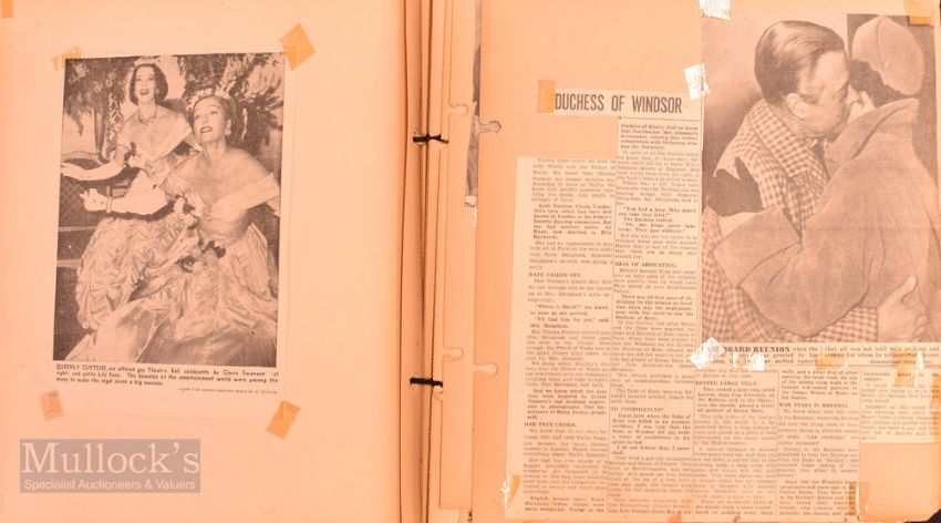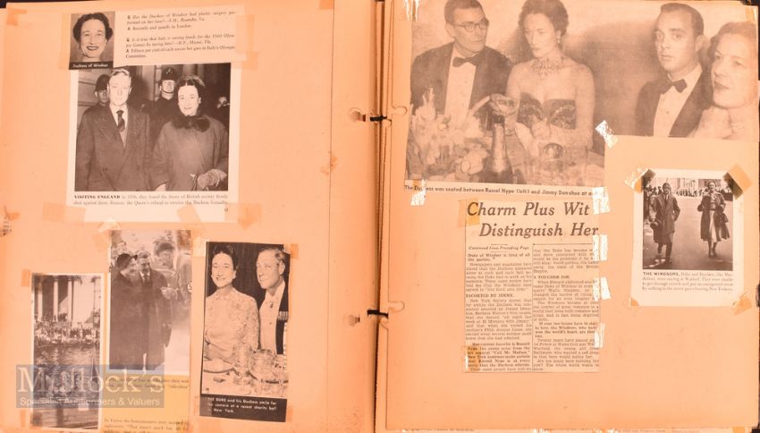 Royalty - 1929 HRH The Prince of Wales Calendar features Jan-Decembers dates below oval portrait measuring 29x25cm approx., together with a scrap album containing multiple newspaper cuttings, a postcard and print - some damage to the front of photograph from blue tack.