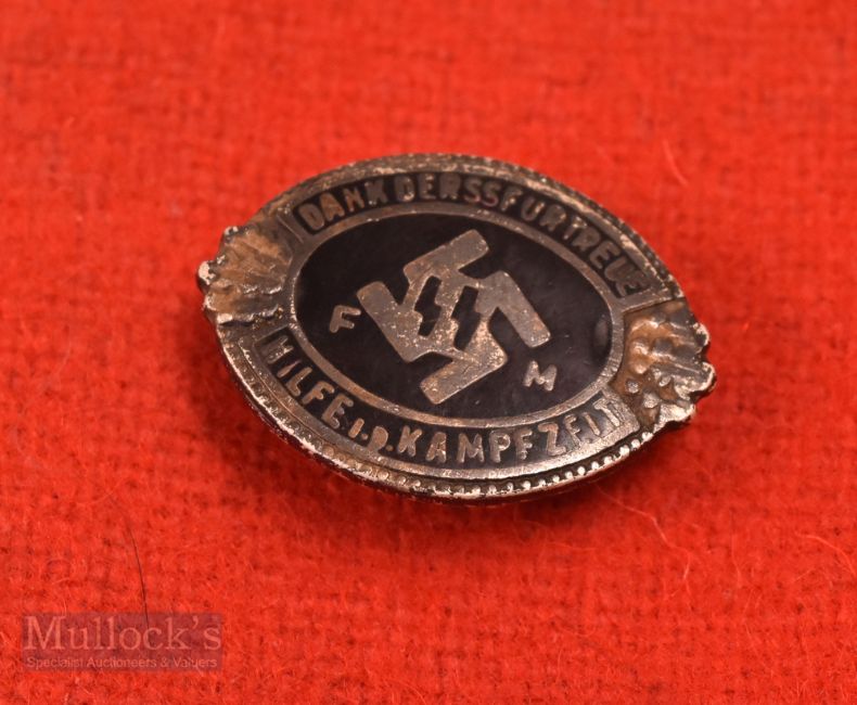 Nazi Germany 'Honour Type' SS-F.M contributing member lapel badge c1935 the reverse with a low early 1253 number, RZM and M1/133 marked. In glass enamel and silver with button type lapel fitting. Measures 2.5cm approx. Whilst it I true the standard post 1933 pins were not RZM marked (like the pre 1933 counterparts), there are a number of the re-issued pre 1933 types to replace lost badges, etc that were definitely issued by an unknown maker with the ghost, non existing RZM number M1/133. These all correspond to the button type reverse and never the stick or brooch fitting