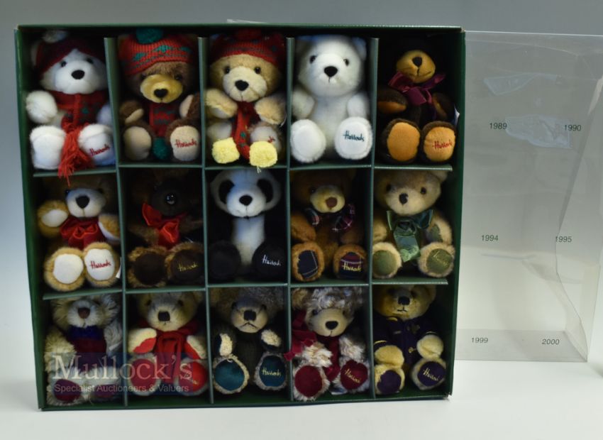 Set of 15 Harrods Knightsbridge Christmas Bears 1986-2000 soft toys the bears are in good condition. The acetate on box lid is cracked.