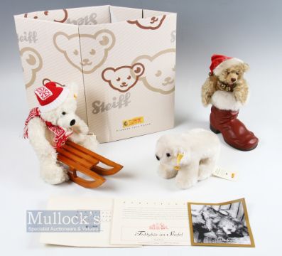 3x Steiff Soft Toys / Jointed Bear, to include Snobby polar bear 11300,15cm tall Steiff Christmas Xmas teddy bear in boot Collaboration with MAROLIN 2001 25cm tall, Steiff Xmas soft toy bear on a sledge 111488 #24cm tall, all in good used condition. (3)