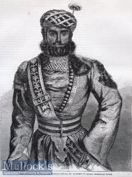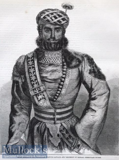 India And Punjab - Meer Heidayut Ali, Rissaldar (Native Captain), 1858 - an original ILN wood engraving titled Meer Heidayut Ali, Rissaldar (Native Captain) 4th Regiment of Bengal Irregular Horse. Ali assisted European civilians in Bhurtpore during The Indian Mutiny of 1857. Engraved dimensions (approx): 22cm x 17cm. Light ageing and foxing