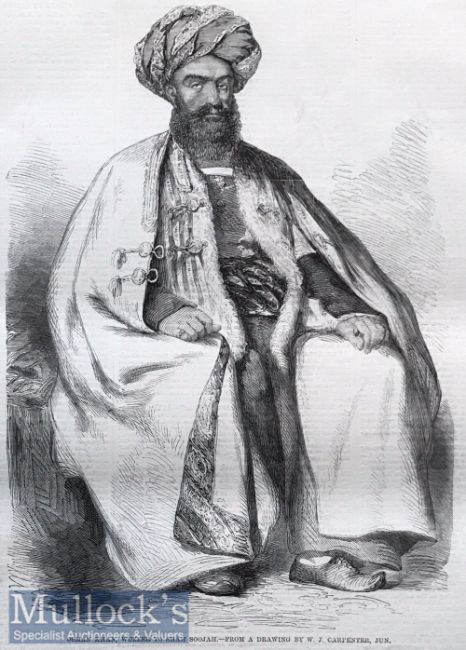 India And Punjab - Osman Khan Wazeer to Shah Soojah, 1858 An original ILN wood engraving titled Osman Khan, Wuzeer to Shah Soojah 1858, from a drawing by W J Carpenter. Osman Khan was employed by the English Government and was in the Fort of Attock when it came under attack by the Sikhs during the Second Anglo-Sikh War. On the settlement of Punjab, he retired to Peshawar. Engraved dimensions (approx): 22.5cm x 16.5cm. Light ageing and foxing